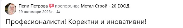 Ние от „Метал Строй - 20" ЕООД - сме се специализирали основно във всички видове ремонтни и монтажни дейности на метални изделия, конструкции и заваръчни услуги.